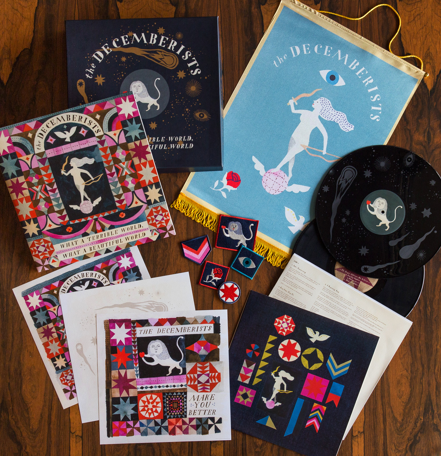 Art direction and packaging design for What A Terrible World, What A Beautiful World. Illustrations by Carson Ellis. Deluxe, limited edition LP box includes satin banner, embroidered patches, 3 lithos, and etched vinyl.